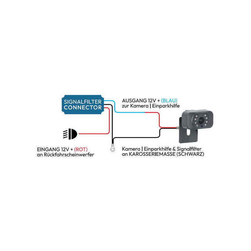 Bitte beachten Sie: Der Masseanschluss des Filters (Schwarzes Kabel)und der Masseanschluss Ihrer Rückfahrkamera/Einparkhilfe muss unbedingtdirekt mit der Karosseriemasse verbunden werden.Die max. Stromabnahme Ihrer Rückfahrkamera darf 1 Ampere nicht überschreiten.